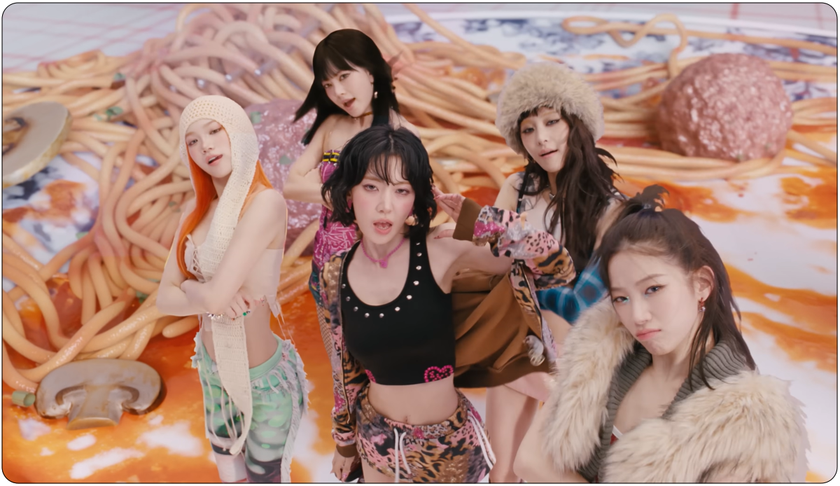 Then ultimately? Le Sserafim’s “debut single album” which is the most wildly inventive (and maybe stretching of the friendship) spin on releasing a single with some remixes, is released. And what do you know? Spaghetti is a mediocre track which has virtually nothing to do with pasta. The lyrics compare the group to spaghetti stuck between your teeth: annoying, persistent, can’t get it out of your head. Mediocre or not, the latter has proven true. Moreover, from that one metaphor they built an entire universe.