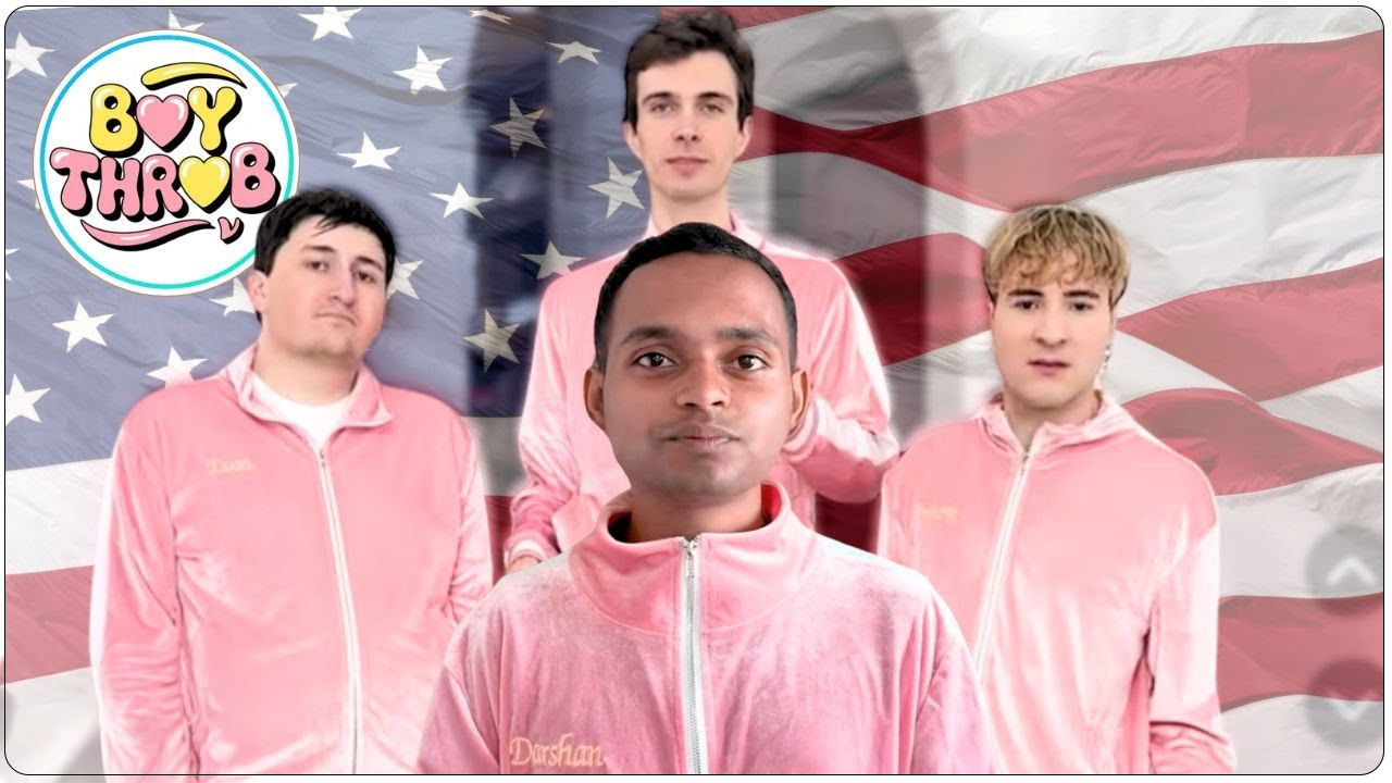 And now, back to TikTok, because we’re not going to leave you for 2025 without talking about Boy Throb. You can completely bin everything we’ve said above. That’s right, just ignore it. Ana Andjelic? Wrong. Product is absolute priority? Insane. If you’re Boy Throb, you can spike from zero to 1 million TikTok followers in a month. All you need is four guys in matching pink tracksuits, one member stuck in India (Darshan), and a solid hook: the requirement for followers to “prove” he qualifies for a US work visa. They perform covers but change the lyrics to be about getting Darshan a visa. Darshan appears via laptop screen.